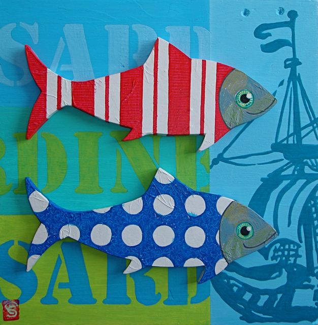 Ses poissons, légers et précieux sur des planchettes de bois, découpés dans du carton plume